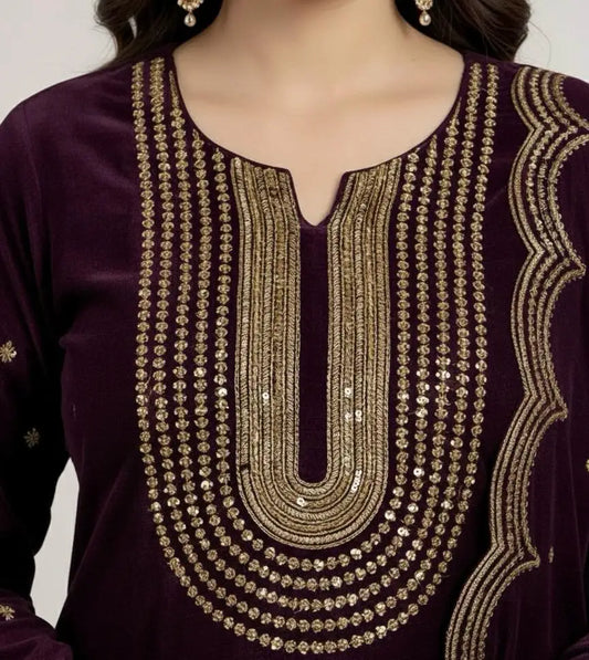 3PC MEHROON PURE VELVET FANCY HEAVY EMBROIDERED