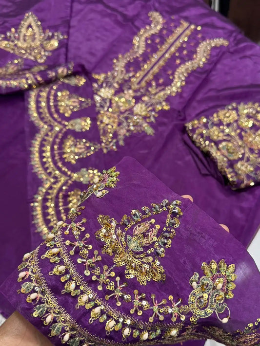 4PC RAW SILK FANCY SUIT FULLY EMBROIDERED WORK
