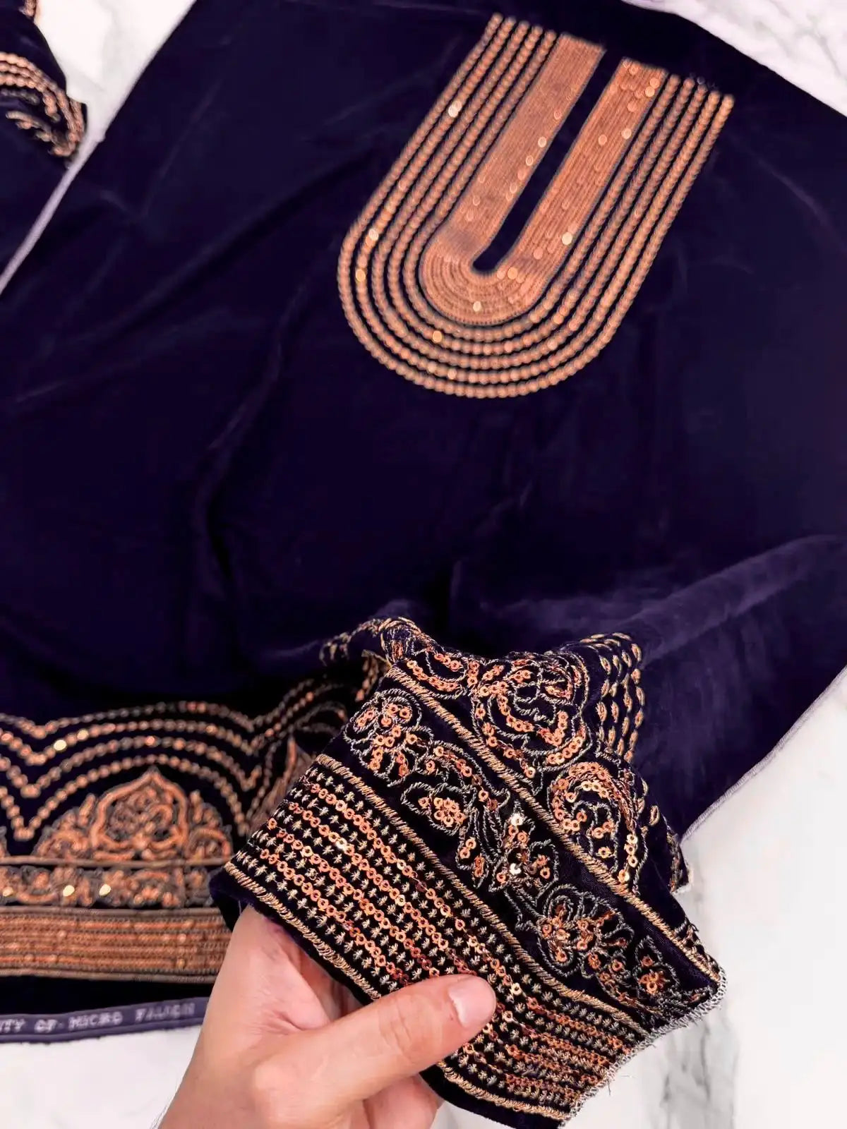 One Of the Beautiful And Elegant Fancy Sequence Embroidery 🧵 Macro 11000 Pound Velvet Shirt And Trouser With Velvet Cut Work Sequence Embroidered Shawl 3 PC Dress