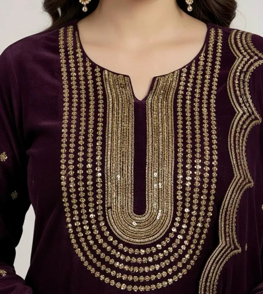One Of the Beautiful And Elegant Fancy Sequence Embroidery 🧵 Macro 11000 Pound Velvet Shirt And Trouser With Velvet Cut Work Sequence Embroidered Shawl 3 PC Dress