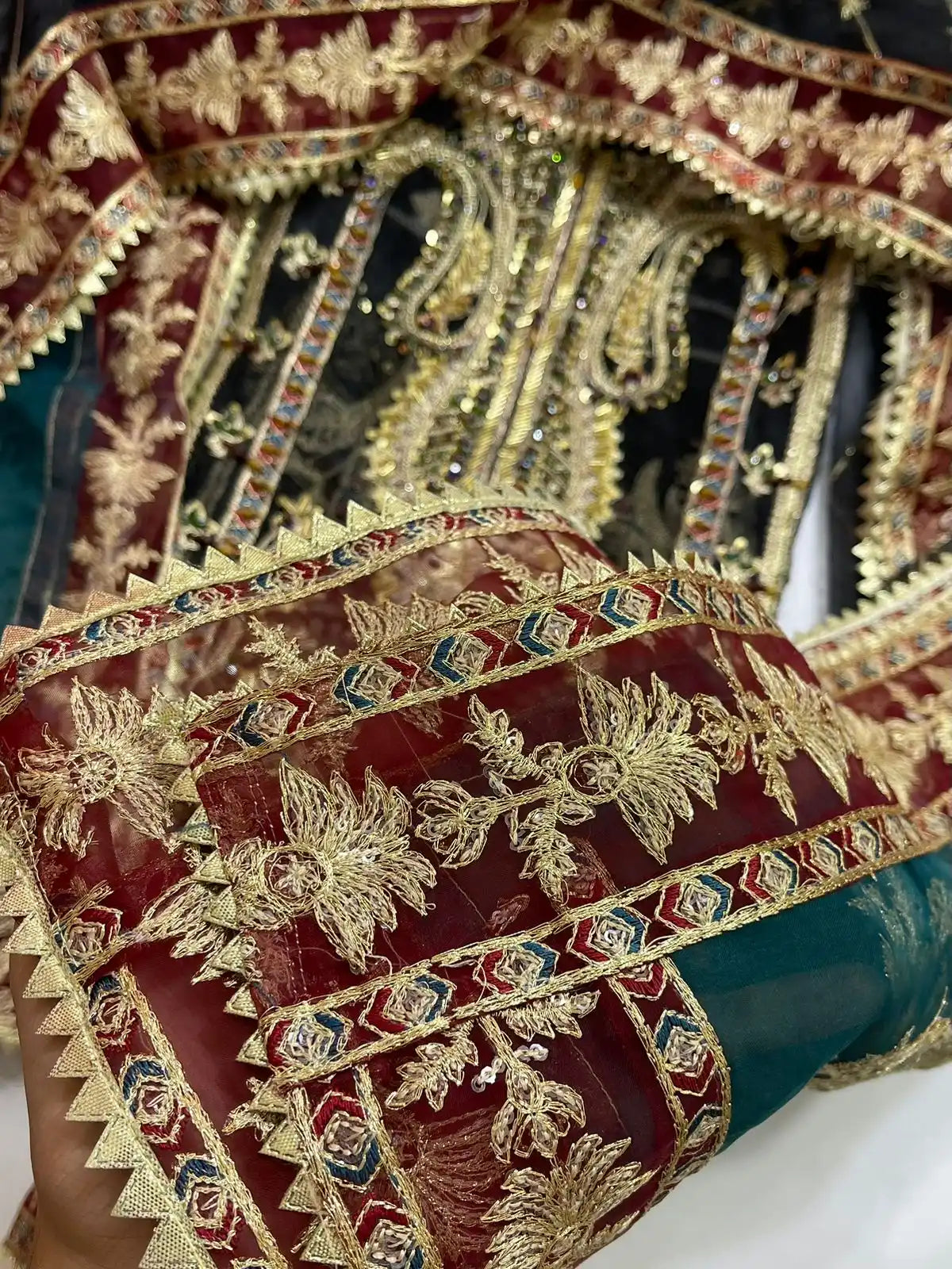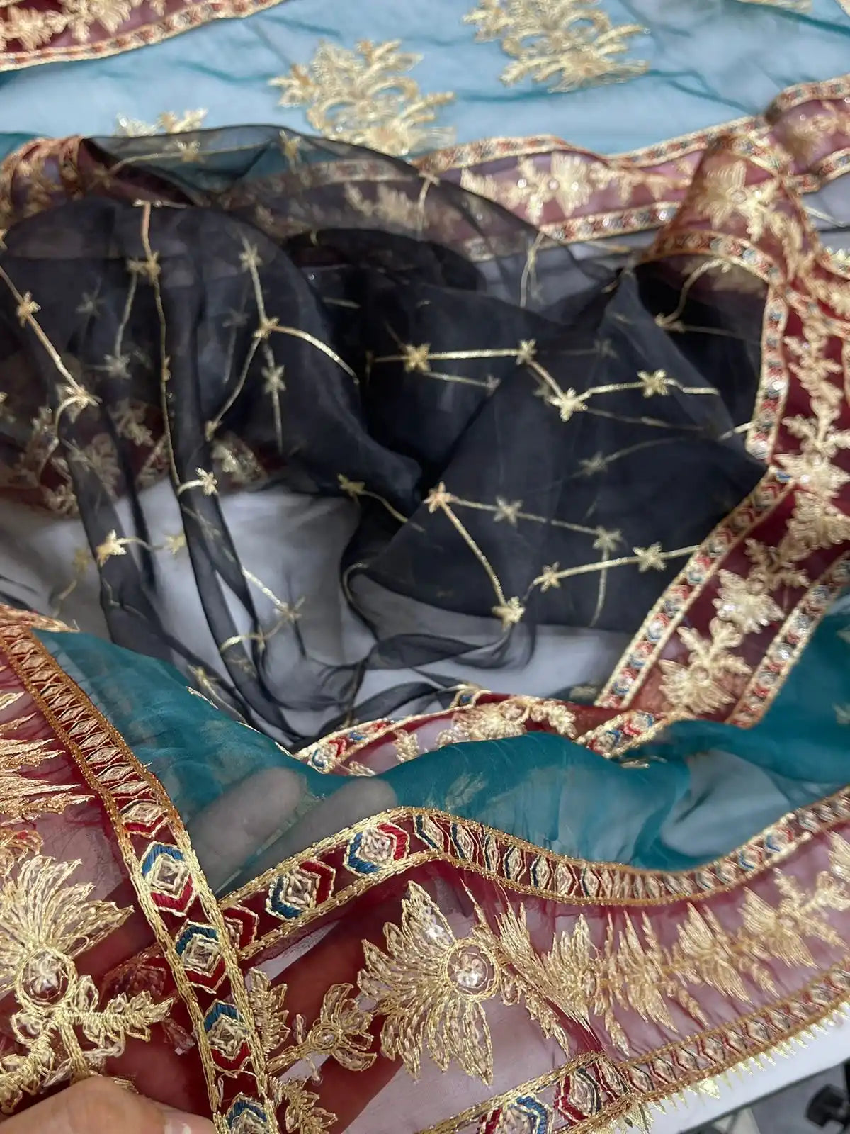 DUPATTA: Beautiful Mehroon Gold Black & Zinc Color Mixture Work Pure Organza Dupatta Fully Embroidery Work