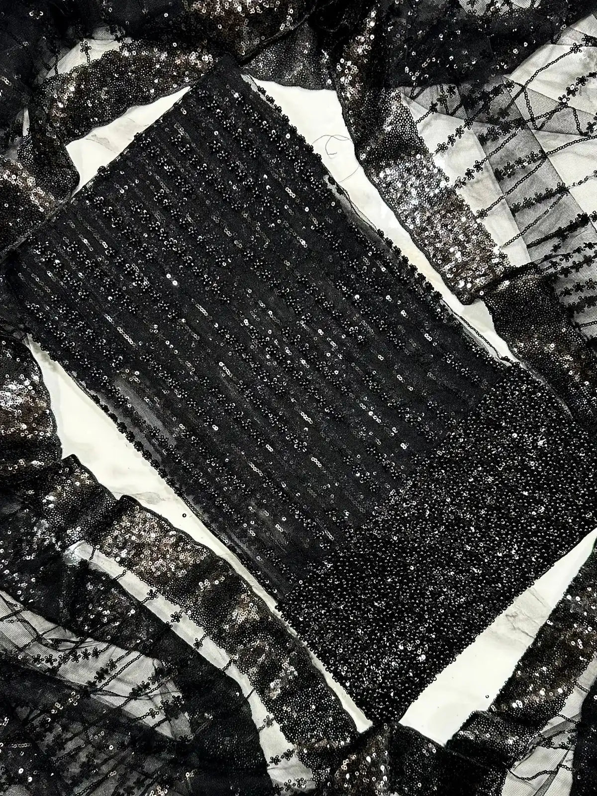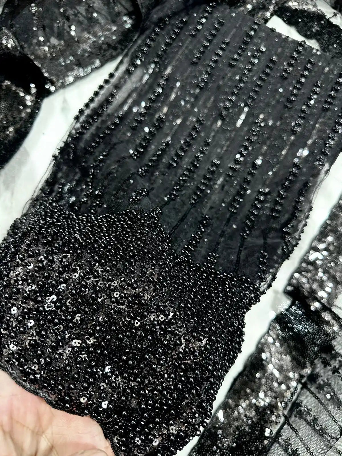 ✨ Sequins Work (silver shine) ✨ Bead Work / Pearl Work (white beads pearls) ✨ Line Pattern Hand Embroidery ✨ Heavy 3D Hand Embellishment (dense pearls + sequins cluster) ✨ Heavy Cut Dana Work