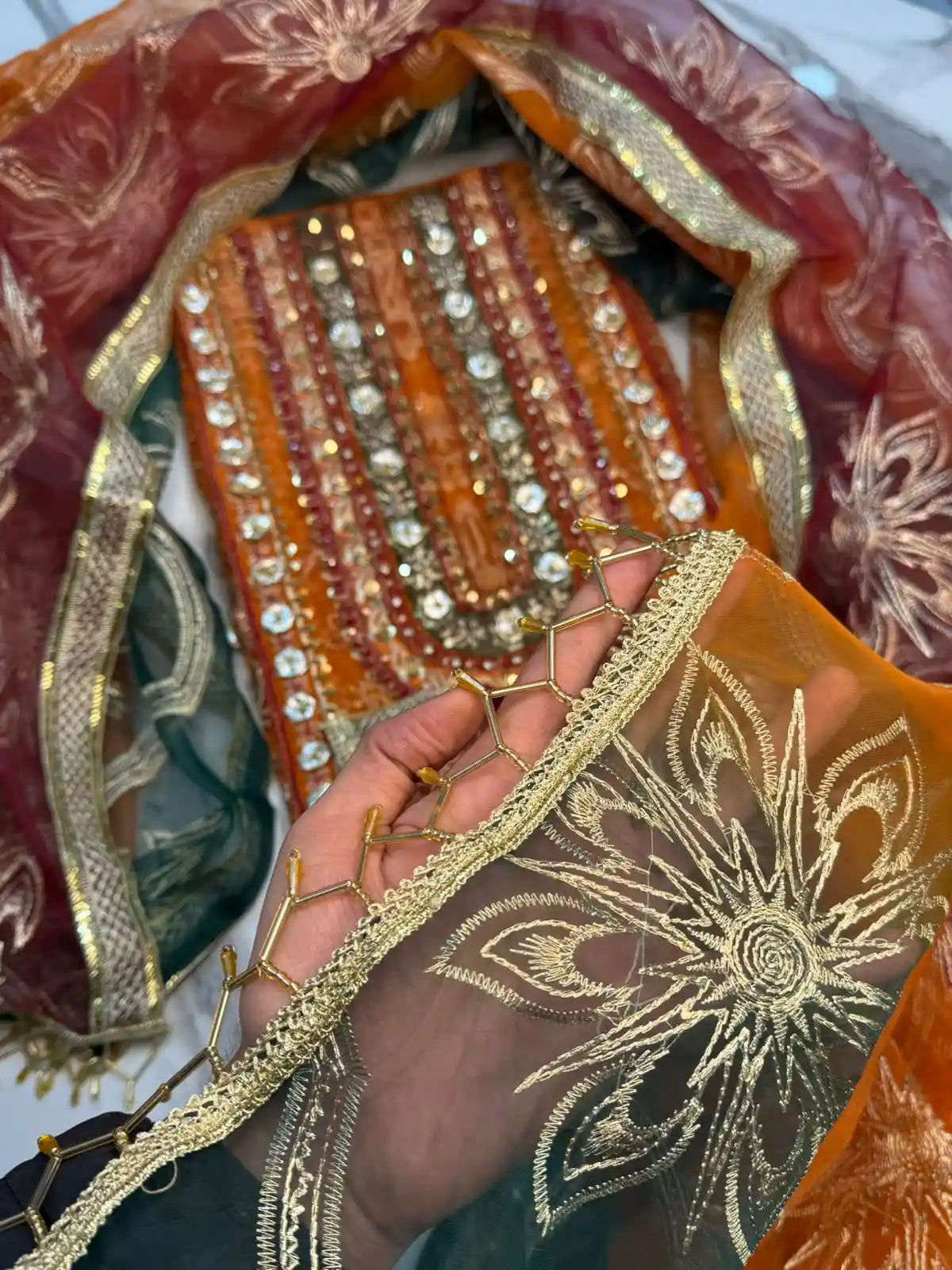 DUPATTA: Beautiful Green Orange and Mehroon Mixture Colors Pure Organza Dupatta Fully Embroidery Work
