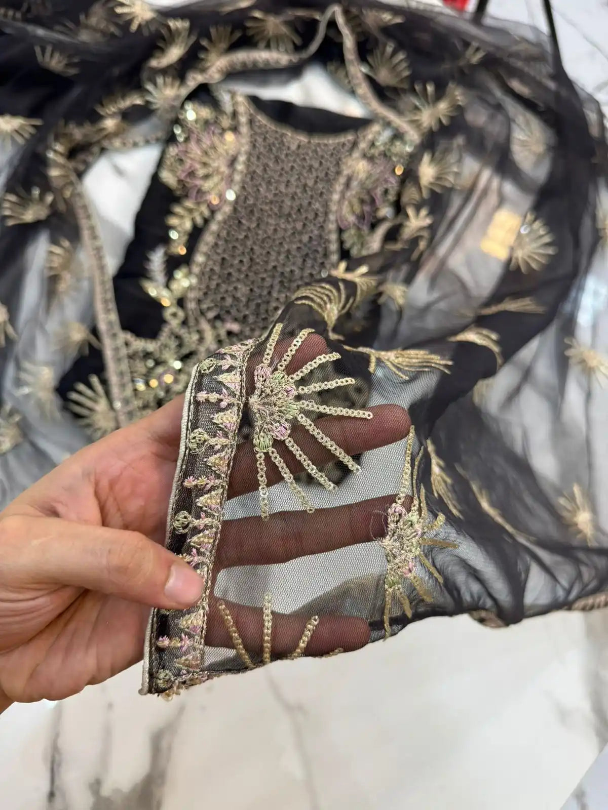 DUPATTA: Pure Net Dupatta Fully Embroidery Work Luxury Look Palu Style Black & Gold Color Dupatta