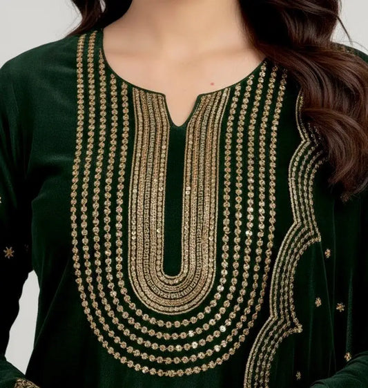 3PC BOTTLE GREEN PURE VELVET FANCY HEAVY EMBROIDERED