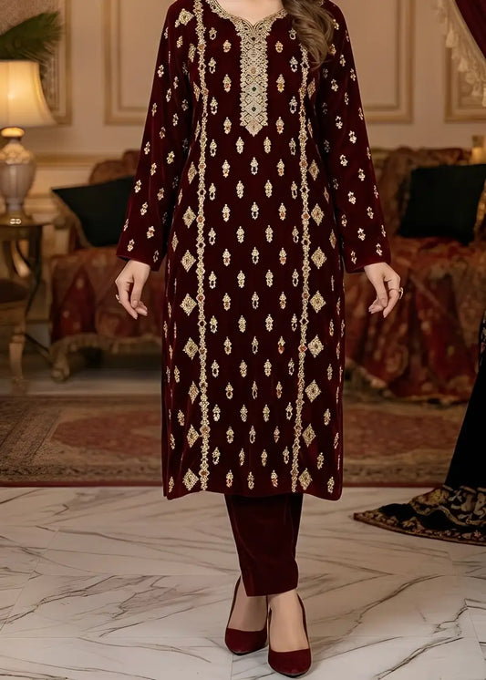 3PC MEHROON PURE VELVET FANCY HEAVY EMBROIDERED
