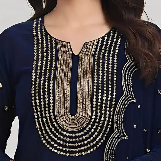 3PC NAVY BLUE PURE VELVET FANCY HEAVY EMBROIDERED